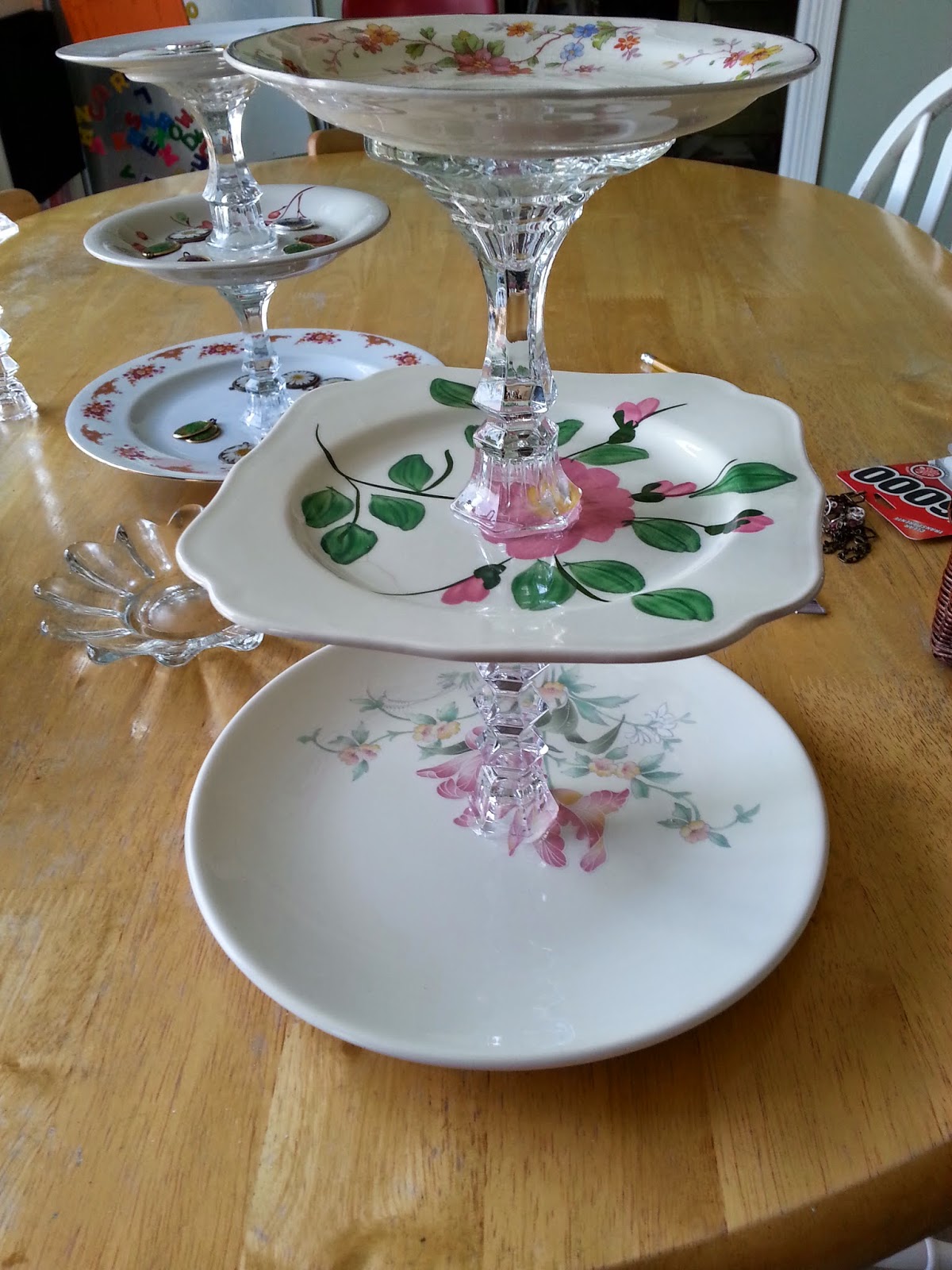 To start, I put the largest plate as my base layer and inverted a glass candlestick. I was careful to find the center of my plate and I used E6000 glue. I wouldn't recommend soaking in water after assembly, it could affect the adhesive properties of the glue.